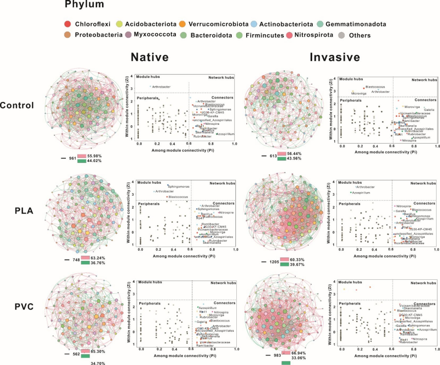 通过微生物共现网络分析发现,在微塑料胁迫下,与本地植物相关的根际微生物网络结构趋于简化和松散,连接度下降。相反,与入侵植物相关的微生物网络复杂度和连接度显著增加,形成了结构更稳健、功能更多元的微生物群落。研究进一步识别出了一批在网络中具有高拓扑重要性的关键类群,如节杆菌属(Arthrobacter)和鞘氨醇单胞菌属(Sphingomonas)。这些微生物对维持整个群落的结构稳定和功能完整性至关重要,并通过促进养分循环等途径,直接增强了宿主植物的胁迫抗性。