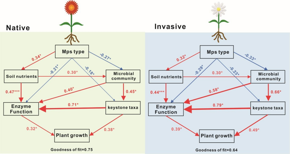 本研究的意义在于证实了微塑料并非只是被动的物理污染物,而是能够作为一种强大的环境筛选压力,通过调节地下微生物群落影响地上植物间的竞争格局。这一发现为生物入侵防治与环境污染管理提供了全新视角:未来通过对土壤微生物组进行靶向调控,或许能为协同应对微塑料污染和生物入侵的双重挑战提供一种创新的生态学策略。