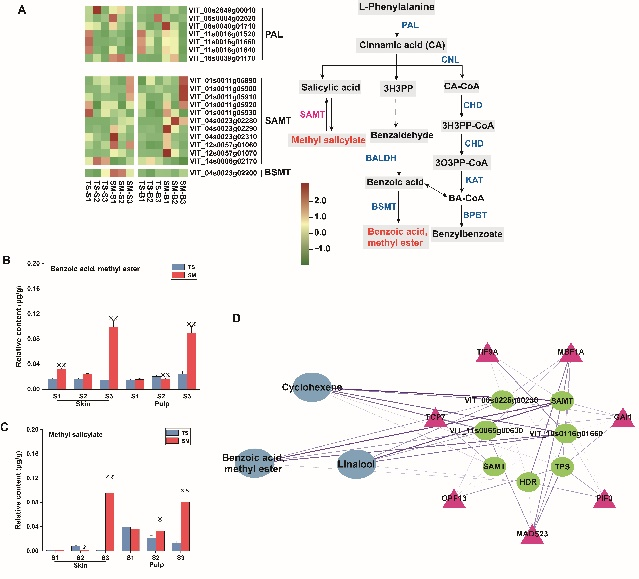 通过转录组学筛选出萜类骨架和苯丙烷生物合成通路中的基因差异表达。WGCNA分析芳樟醇、萜品油烯、水杨酸甲酯和苯甲酸甲酯与tan??橹械牟钜旎蚬脖泶?,在该模块中建立了芳樟醇、萜品油烯和苯甲酸甲酯与代谢物合成关键基因HDR和SAMT及转录因子共表达网络图。已有报道发现芳樟醇和玫瑰氧化物等单萜化合物是玫瑰香型葡萄特征香味物质,本研究进一步补充了酯类水杨酸甲酯和苯甲酸甲酯与单萜类芳樟醇协同积累形成葡萄的玫瑰香味。本研究为香味葡萄风味形成机理奠定了理论基础。